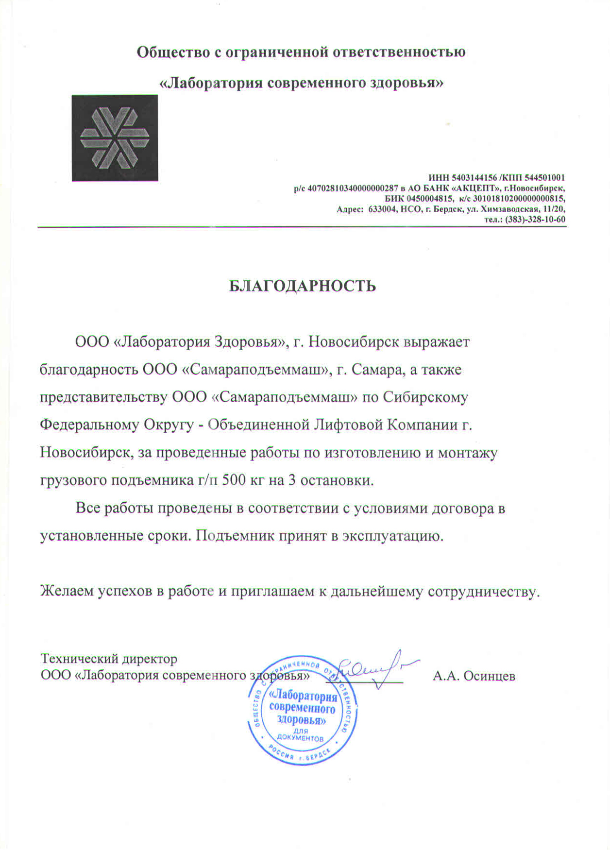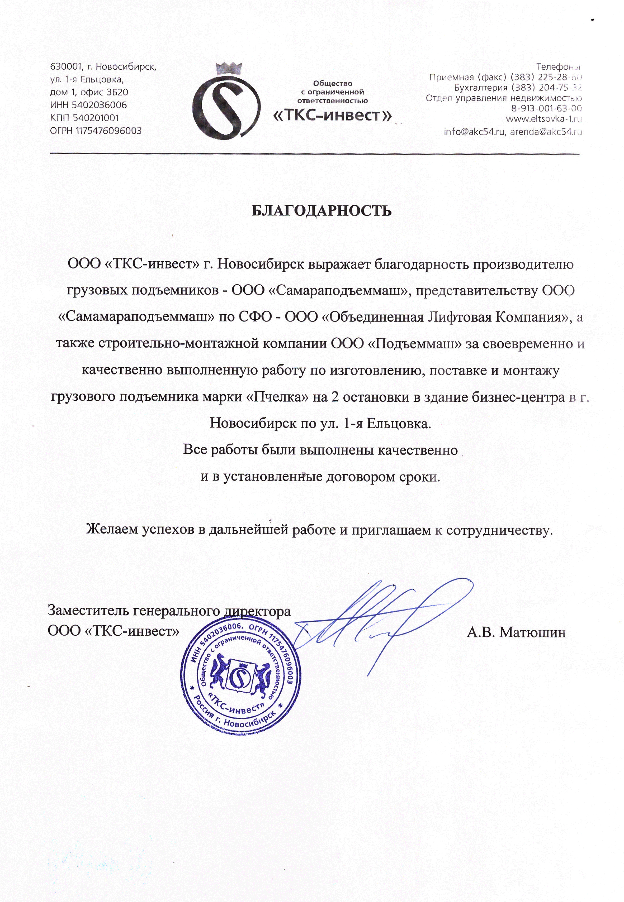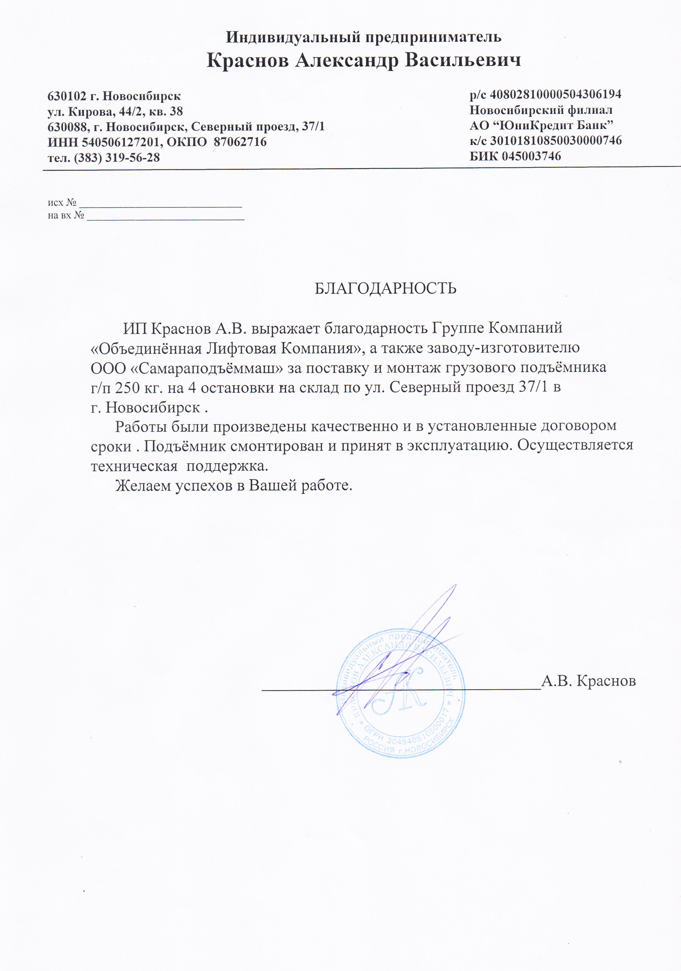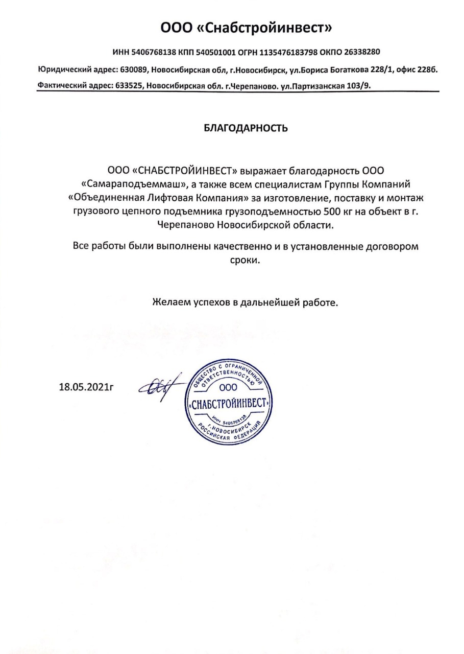 Выражаем благодарность всем специалистам ООО «СПМ» за своевременное и качественное выполнение работ по устройству 3-х грузовых подъемников для производственных цехов «Хлебокомбината «Инской», г. Новосибирск.