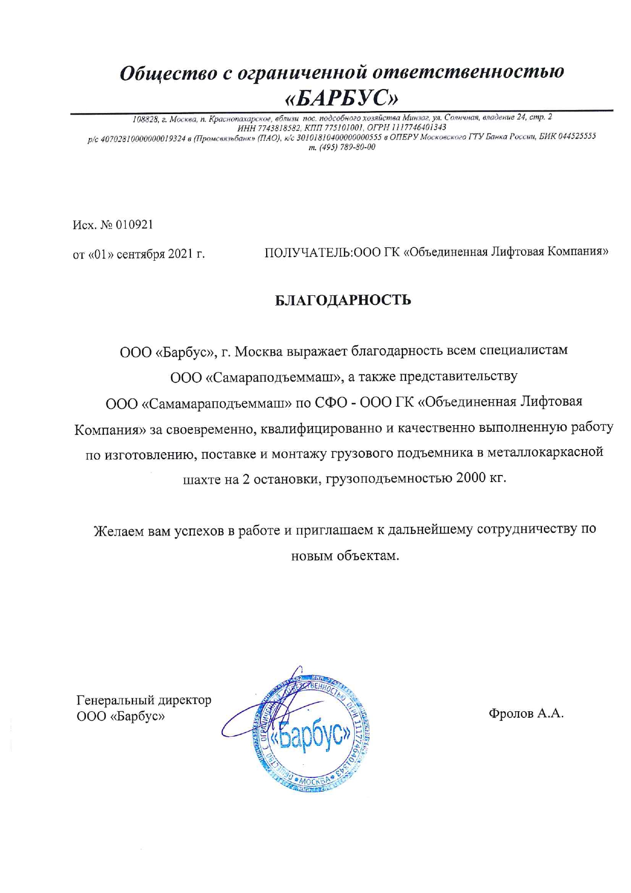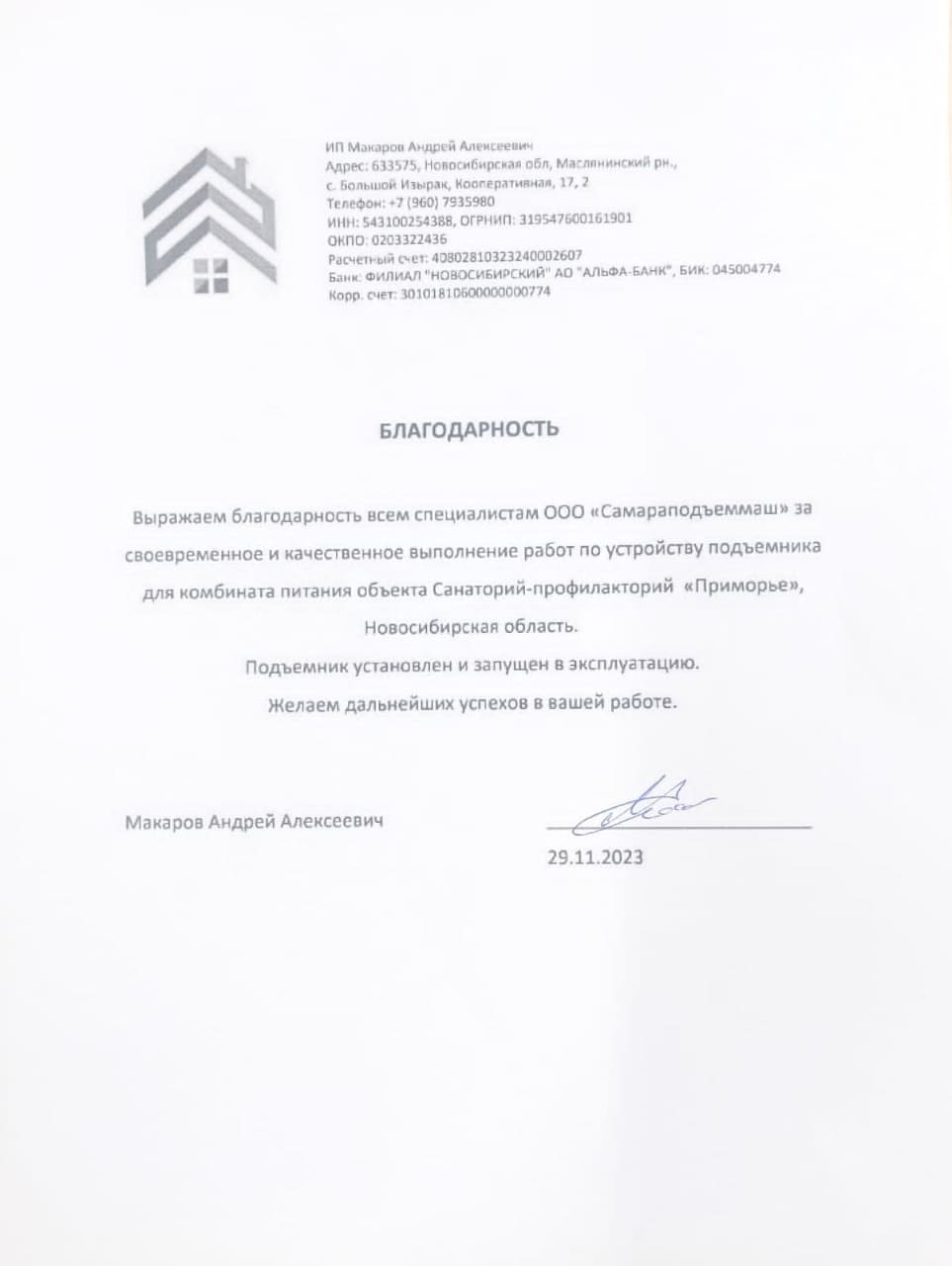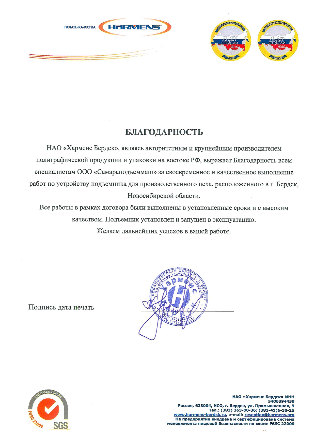Выражаем благодарность всем специалистам ООО «СПМ» за своевременное и качественное выполнение работ по устройству 3-х грузовых подъемников для производственных цехов «Хлебокомбината «Инской», г. Новосибирск.