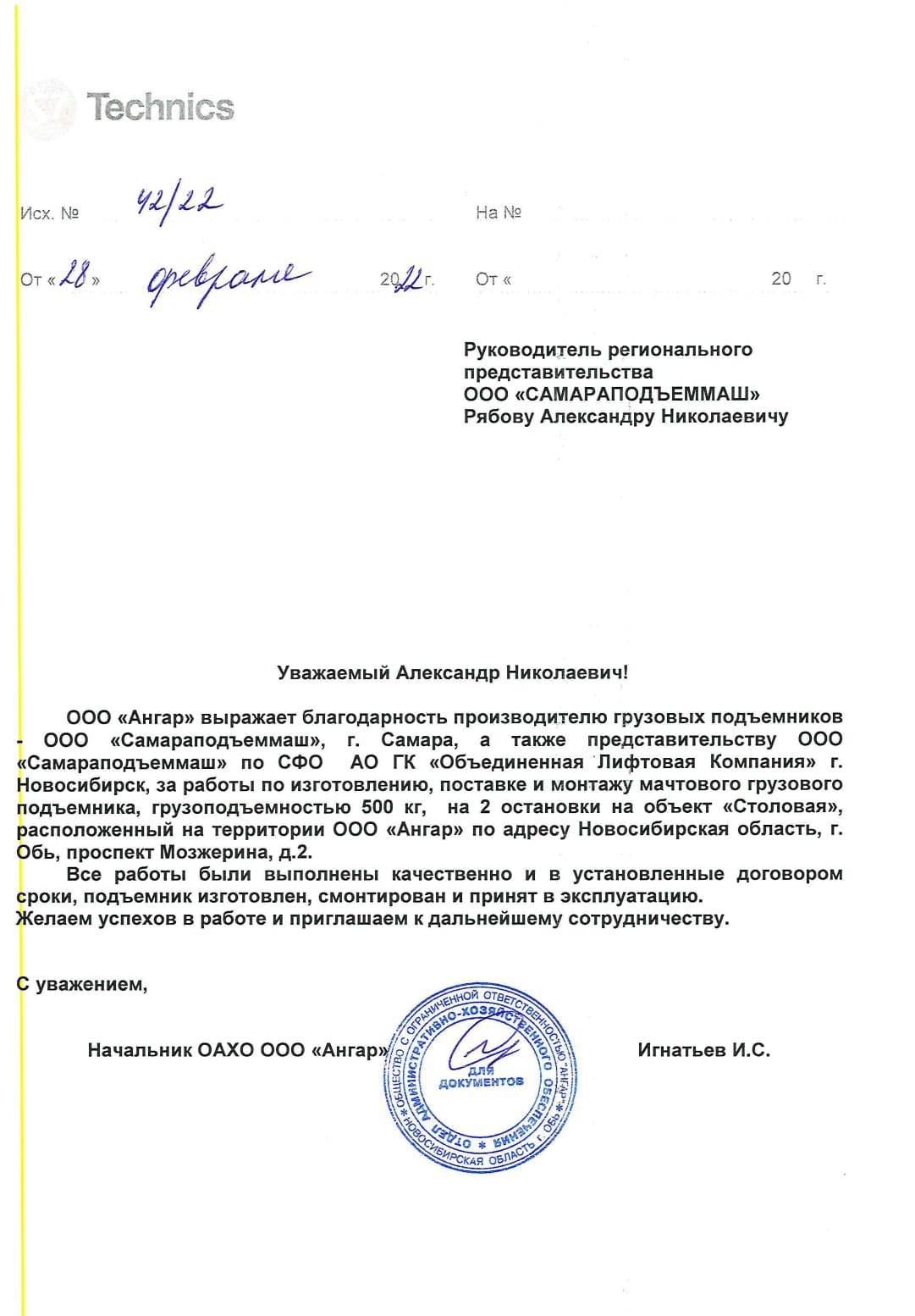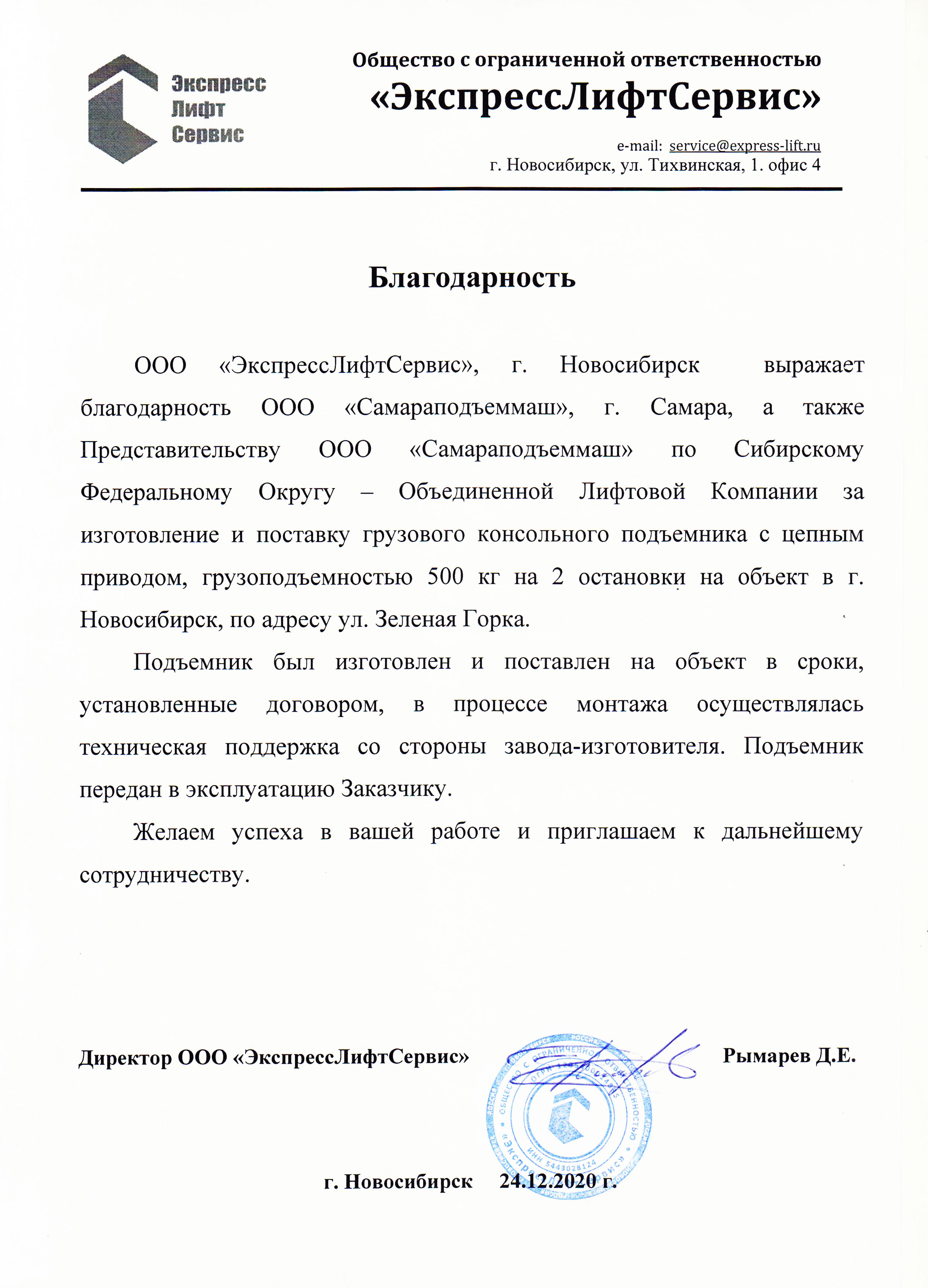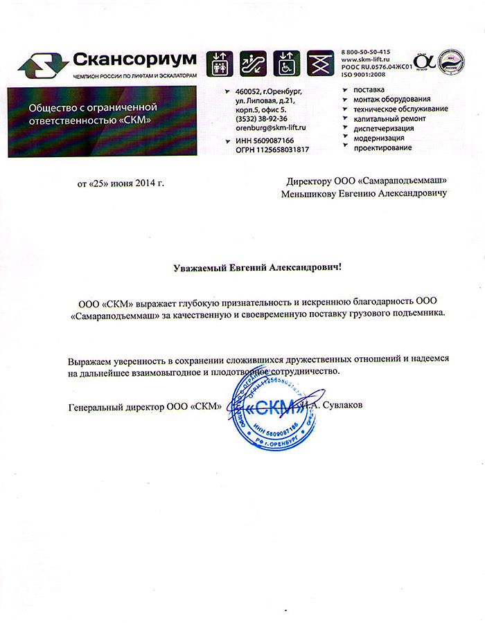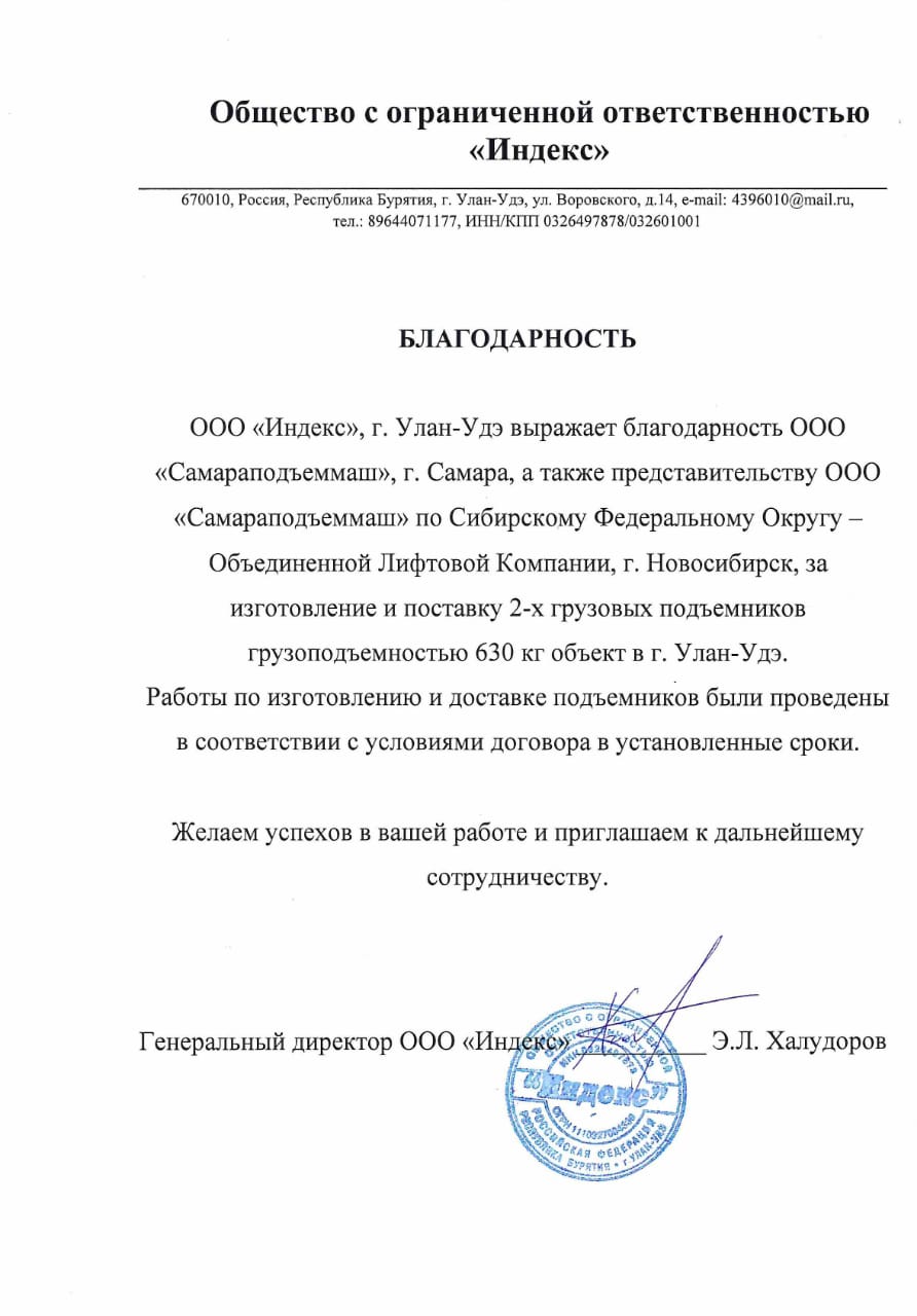 Подъемники установлены в соответствии с договорными сроками и запущены в эксплуатацию. Желаем дальнейших успехов в вашей работе.